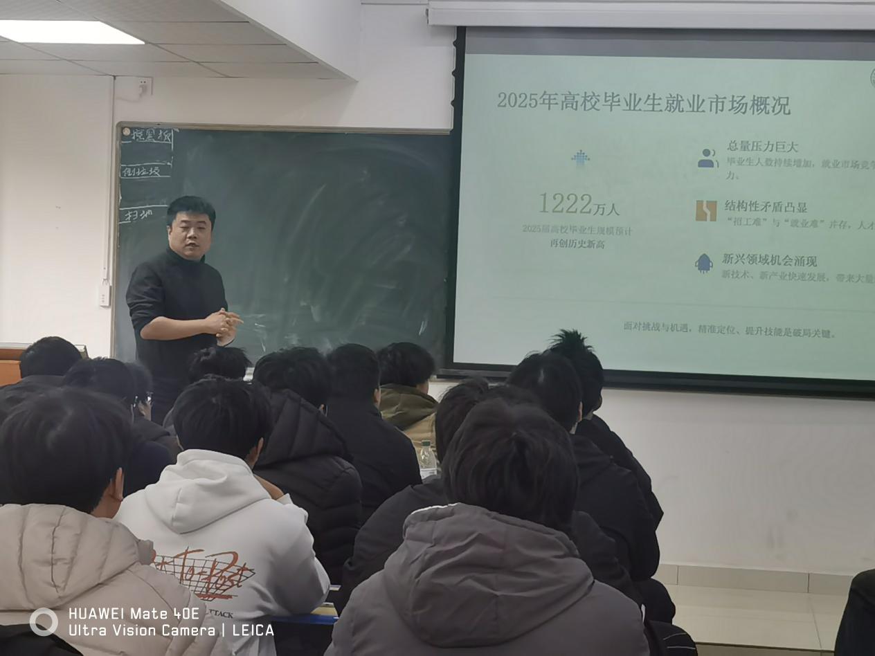 为深入落实学校招就处“迅速开启‘就业第一课’,利用开学契机做好就业动员与形势教育,营造积极求职氛围”的工作要求,切实帮助学生明晰职业方向、认清就业形势,近日,智能制造与机电学院负责人刘彦辰、学院学生工作负责人郑腾飞分别走进班级,为学生讲授开学“就业第一课”,把就业指导精准送到学生身边。